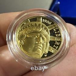 This three-coin proof set of the United States Mint is a must-have for collectors and enthusiasts alike. The coins are uncirculated and have a proof strike type, making them in excellent condition. The set comes in a beautiful case, making it a perfect display piece for any collection. The coins feature the iconic images of Liberty and the American flag, with the gold coin depicting the Statue of Liberty. The set is certified by the U.
